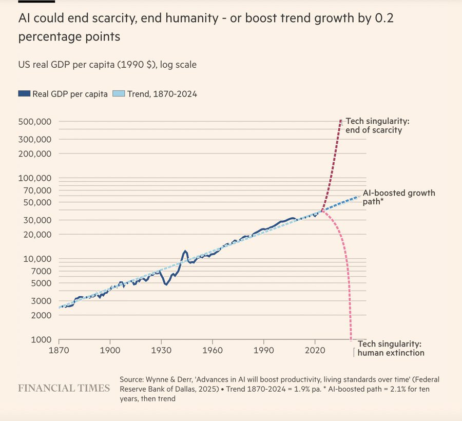 AI wizards, Silicon Valley’s “first principle thinkers” mingle with self-anointed experts on X in speculative future-porn storytelling. We are as confused as this FT chart that went viral this week: